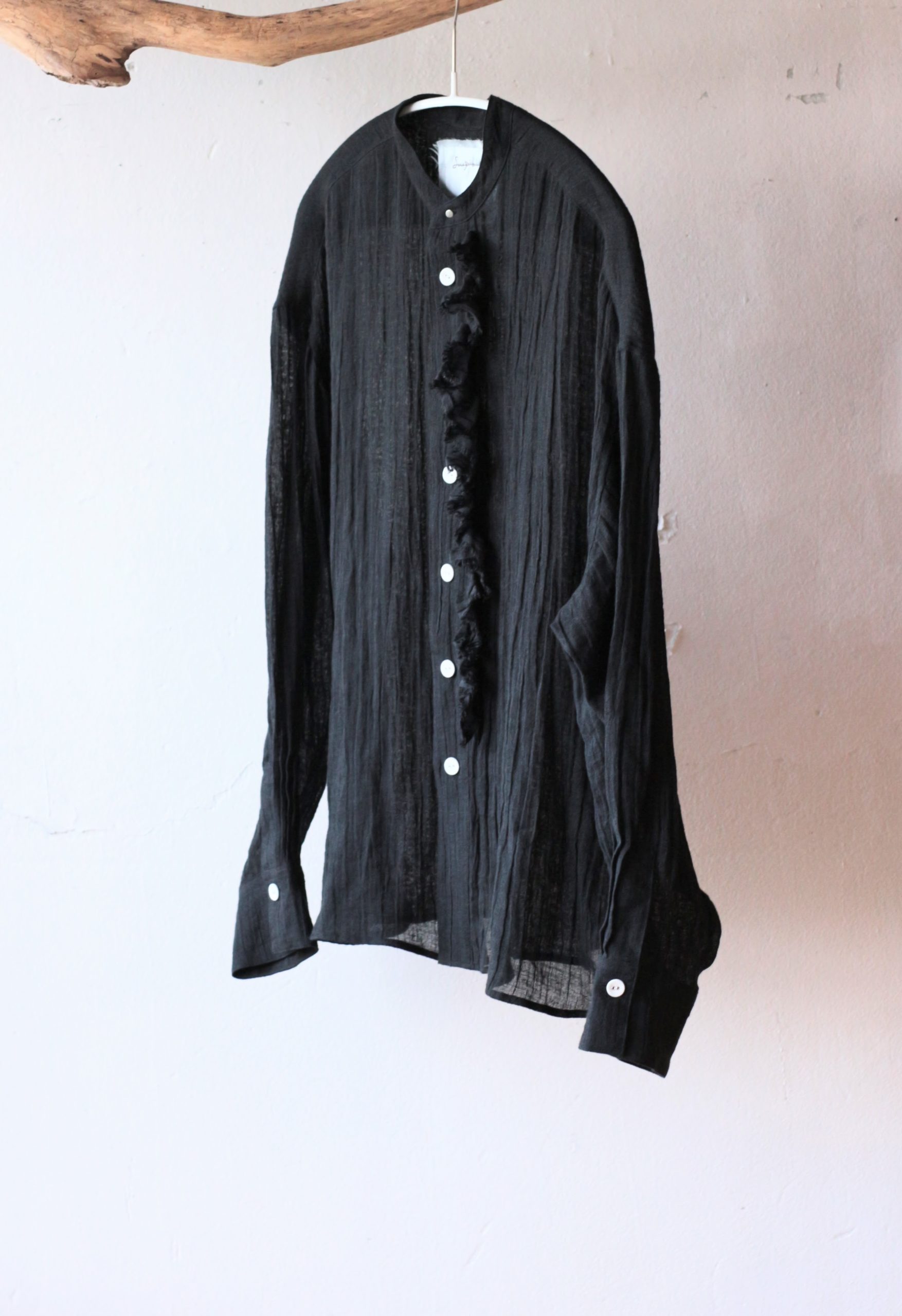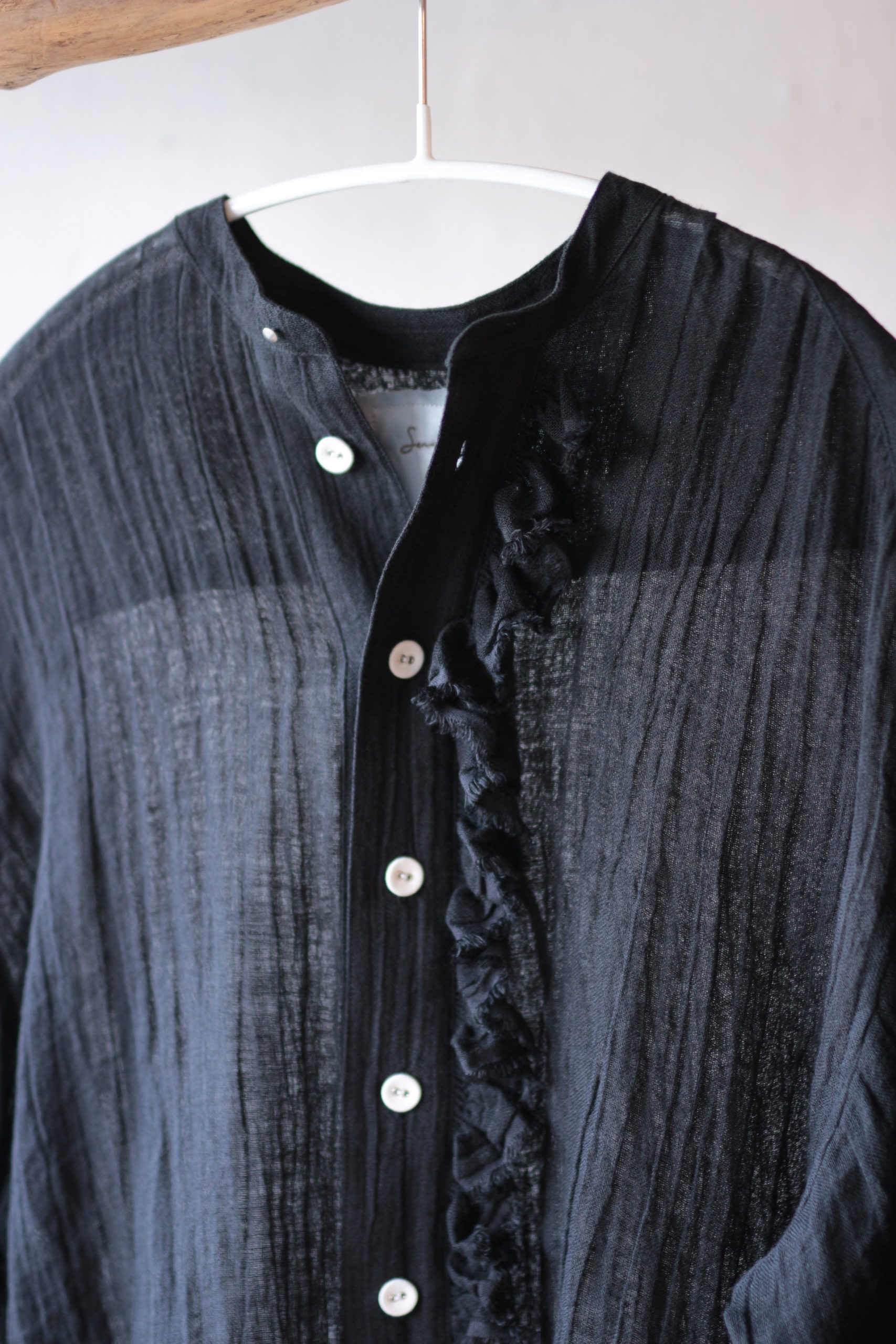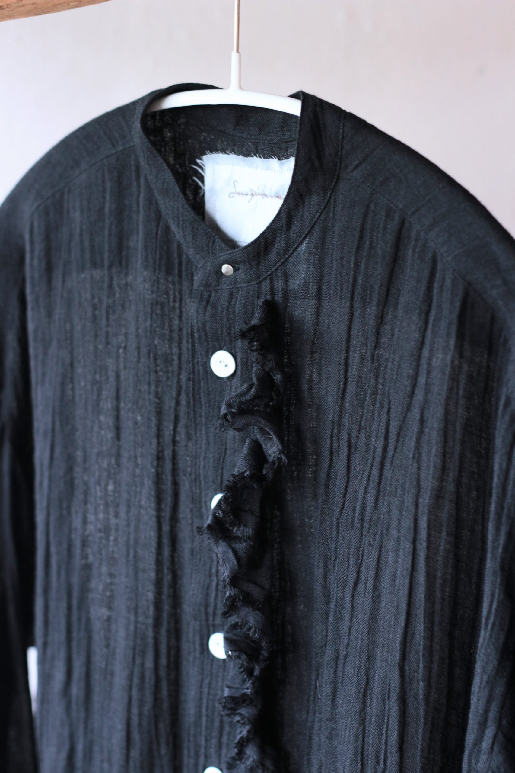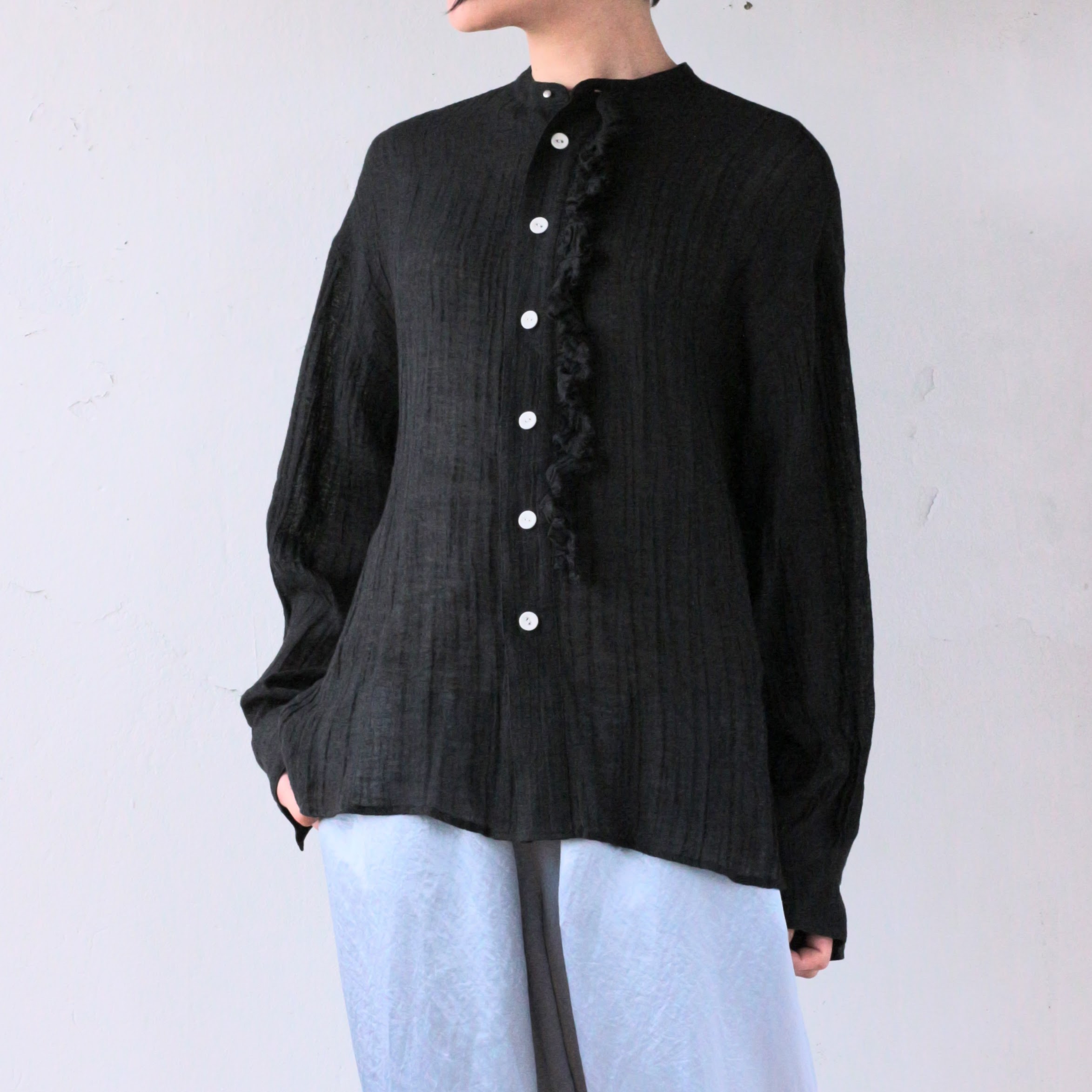 定番のフリルシャツショート・炭黒のリネンで仕立てました。