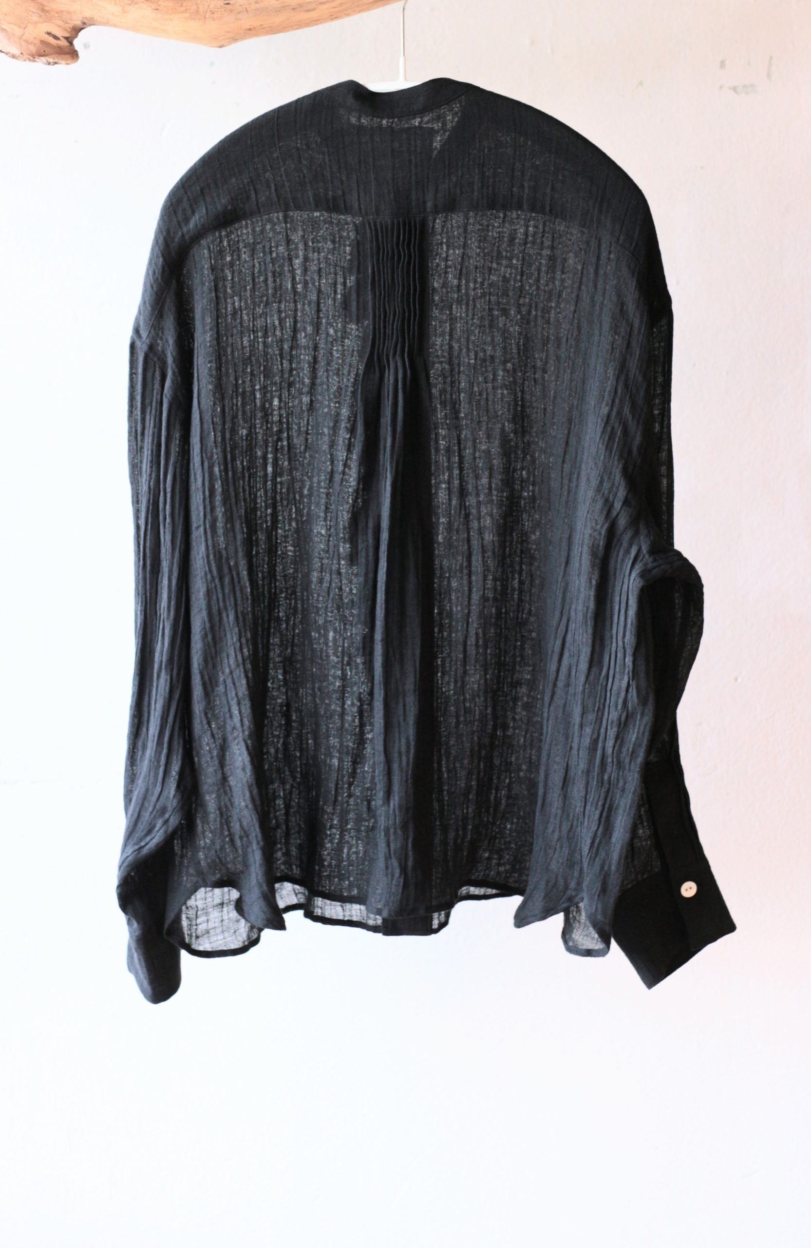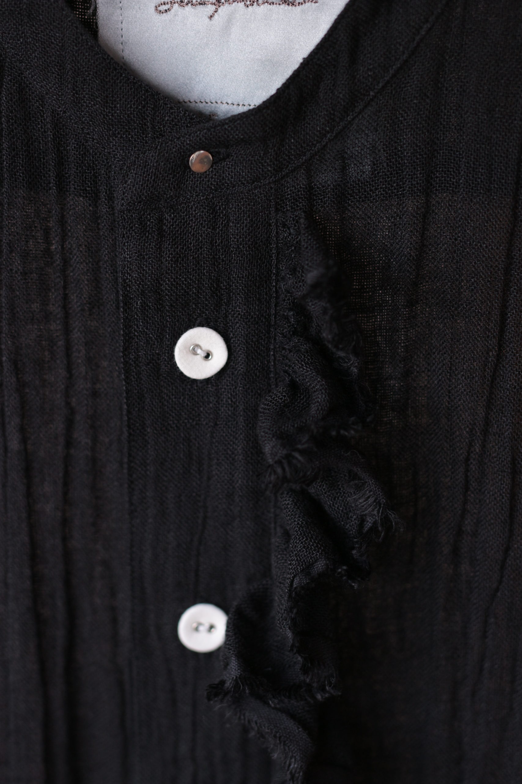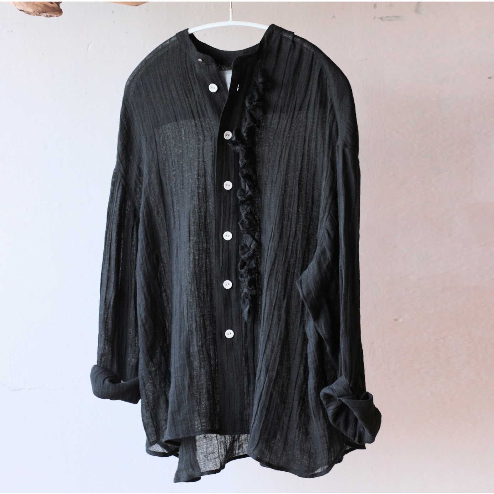 定番のフリルシャツショート・炭黒のリネンで仕立てました。