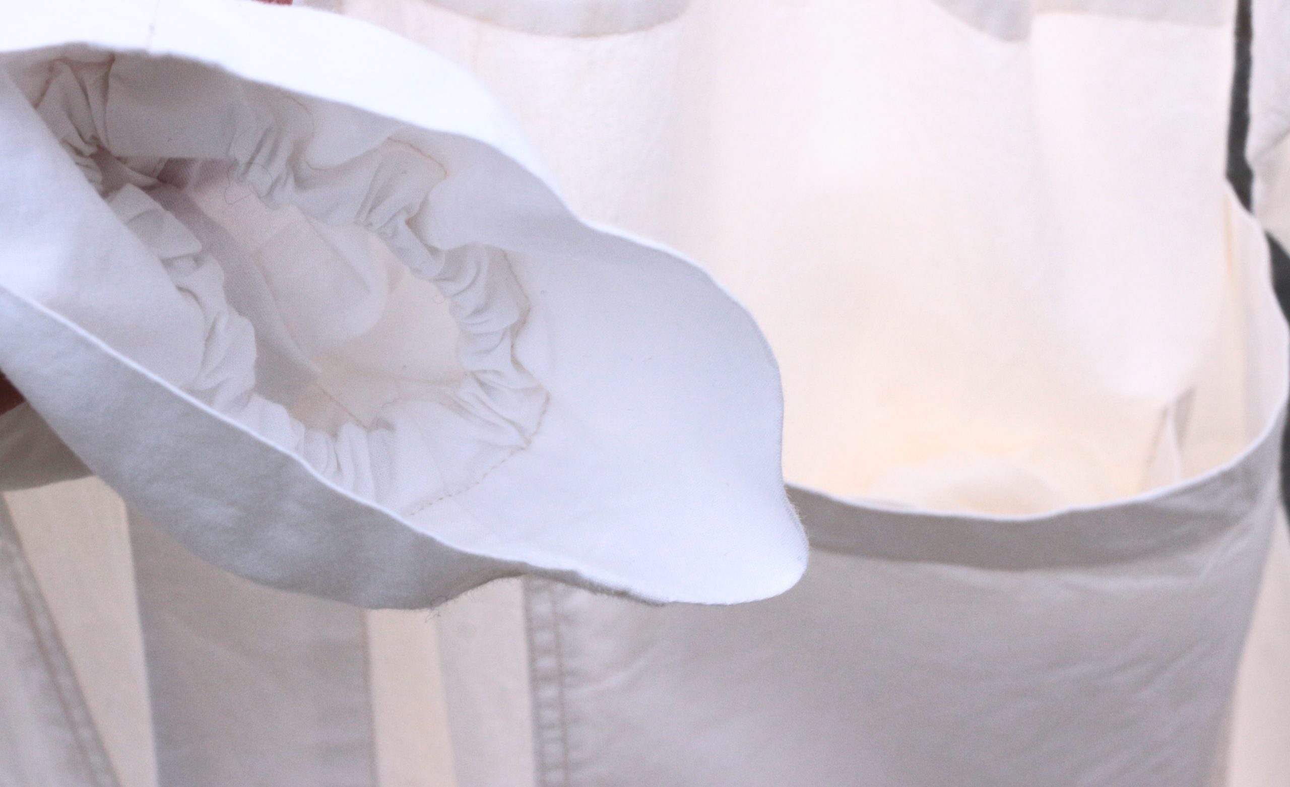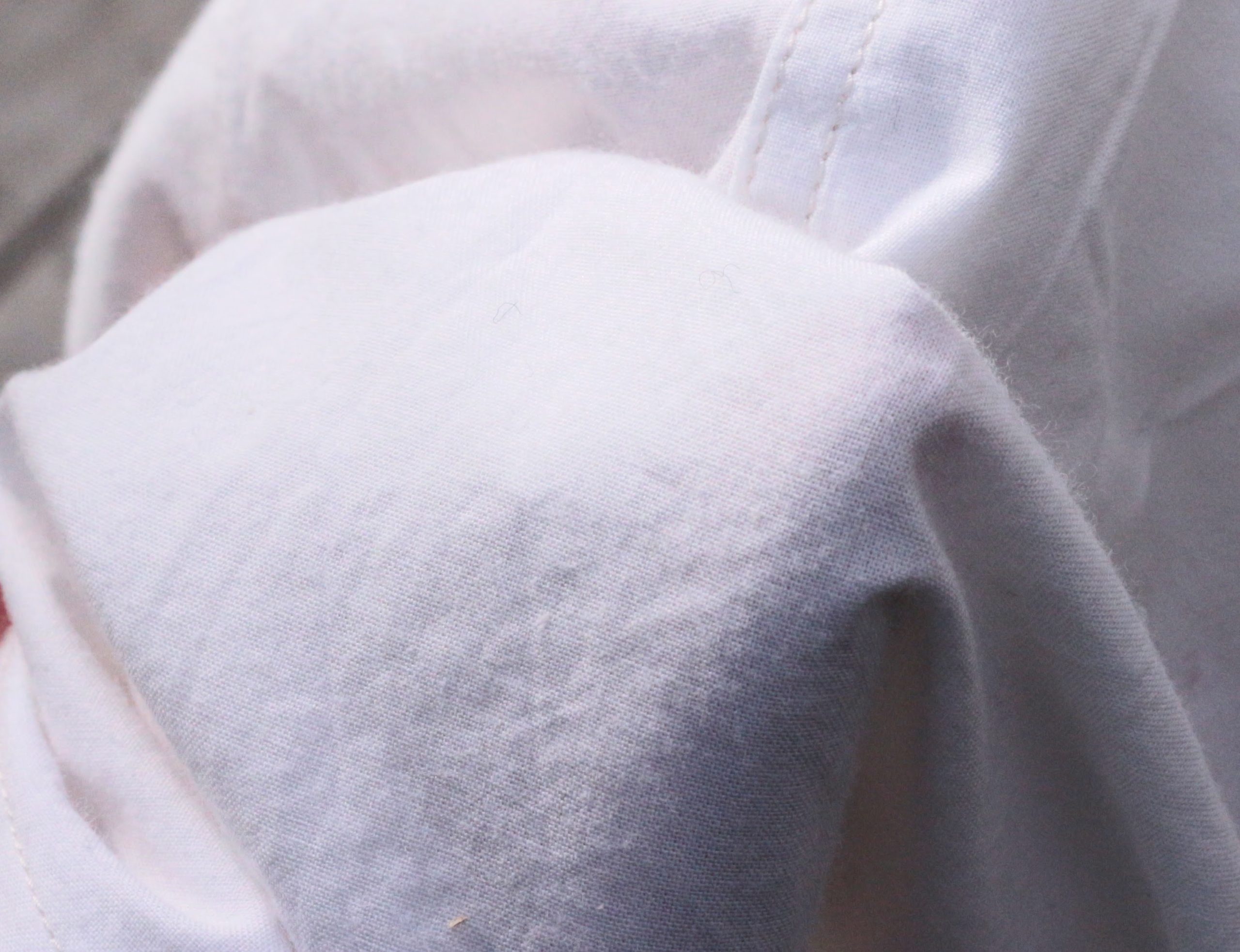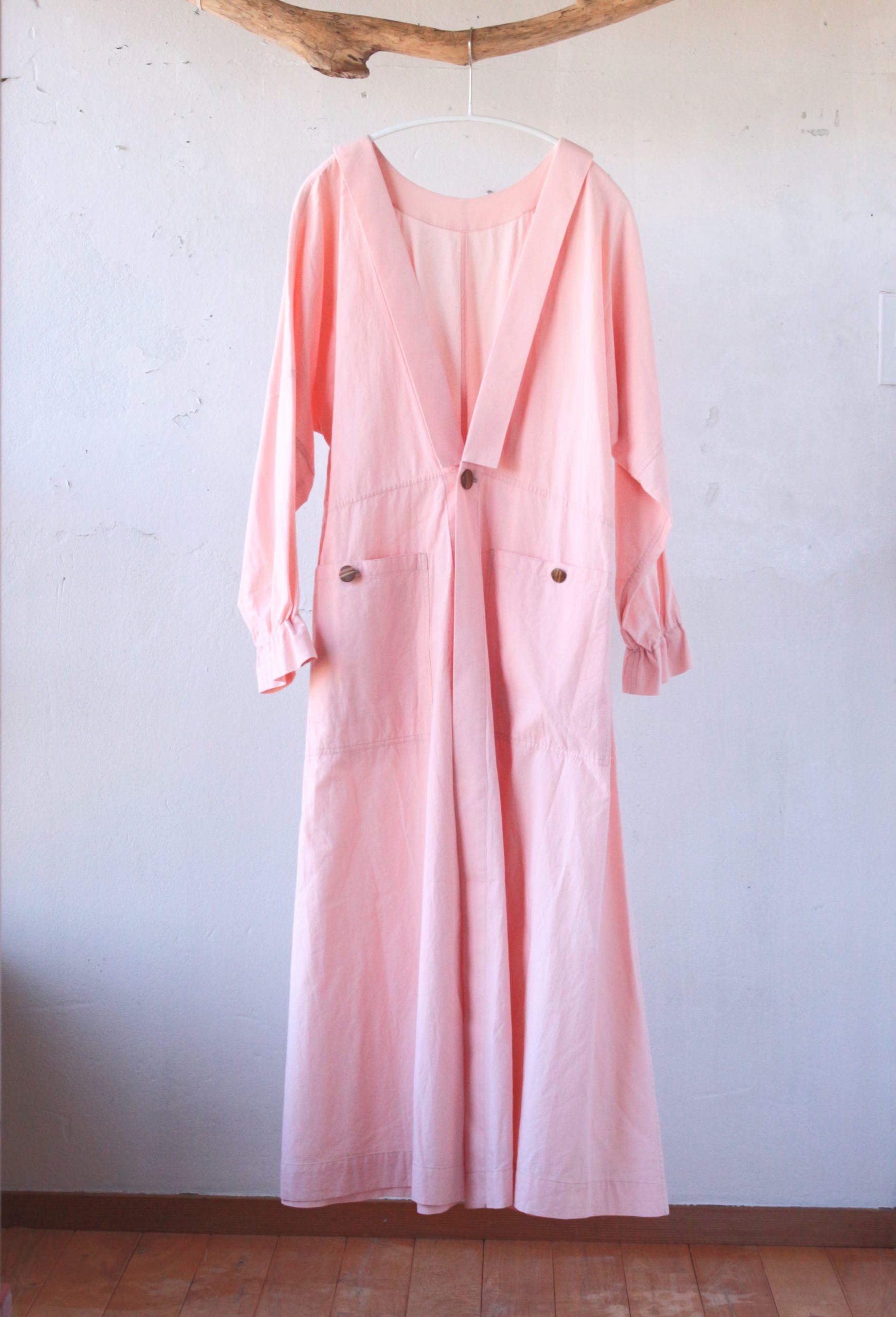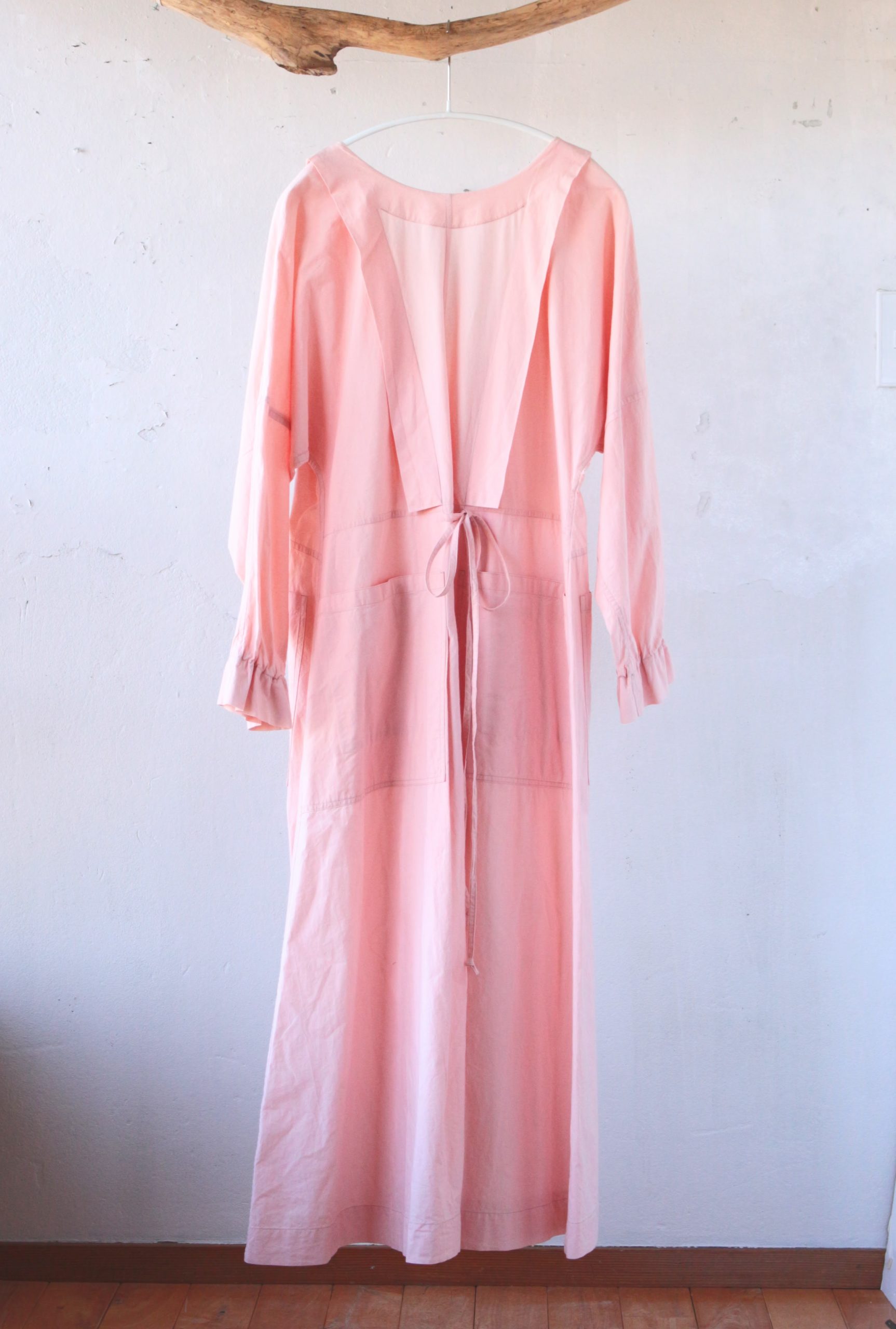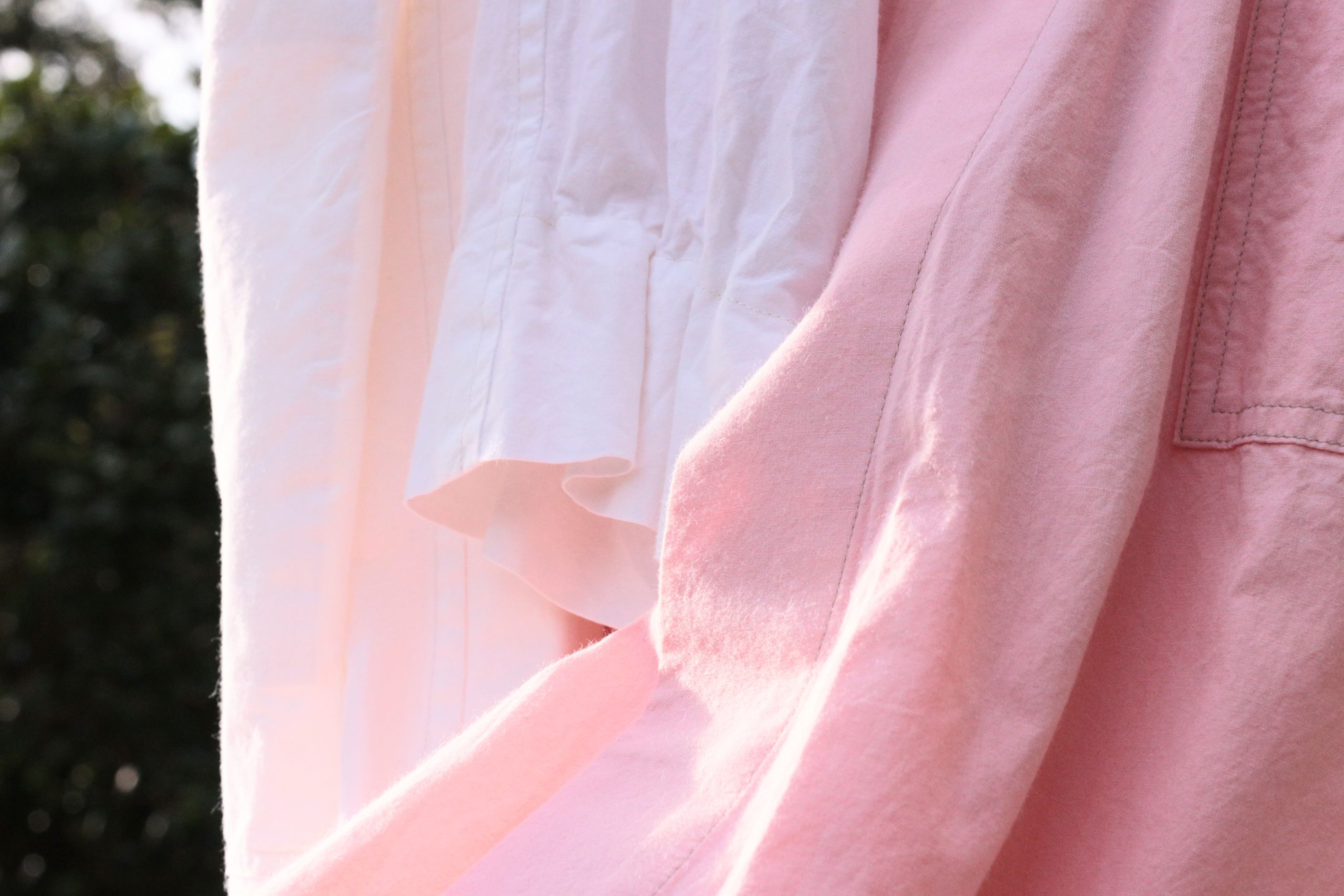 素材は、インド製のオーガニックコットンを使用して、ほのかに綿花の柔らかみのあるシャツ地ほどの厚み感。白は綿花の色そのままに、ピンク色は茜を使用した植物染めとなっています。