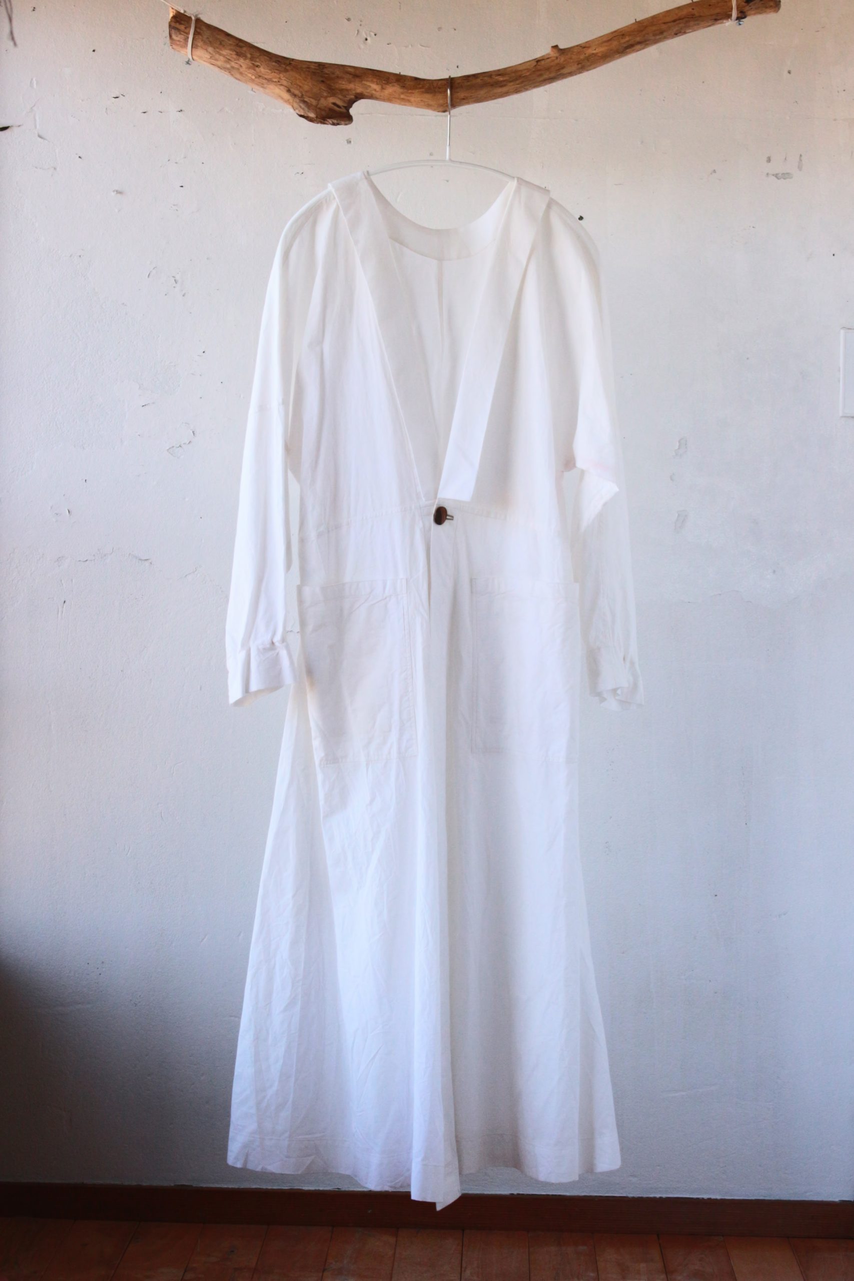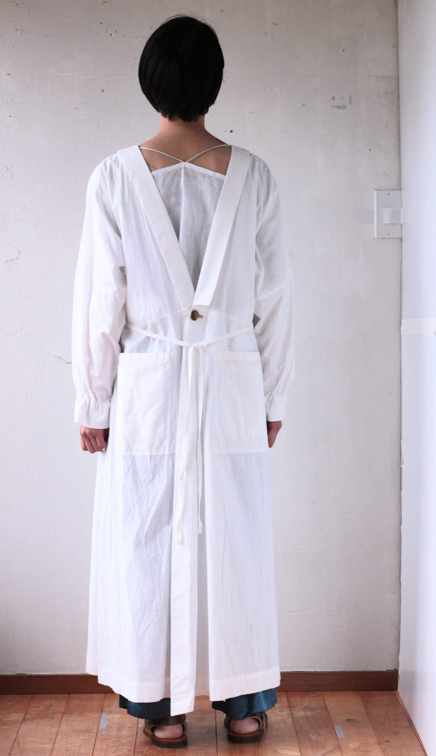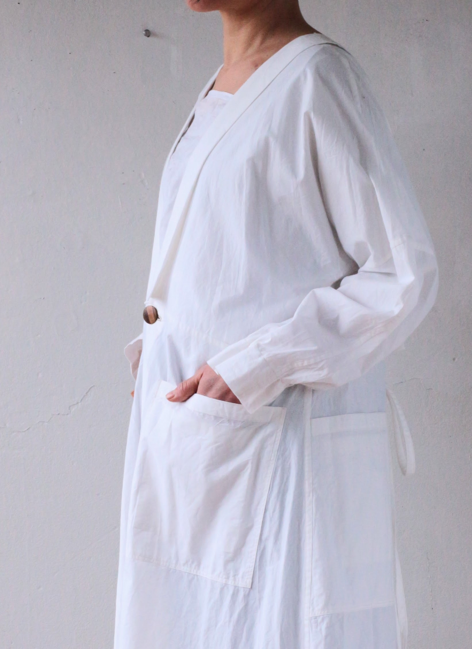 身頃とひと続きとなっている着物襟は、立てたり寝かせたりすることもでき、前後に合計4箇所付いているポケットは、それぞれにダブルポケットとなっていて、大小物の収納に実用的です。