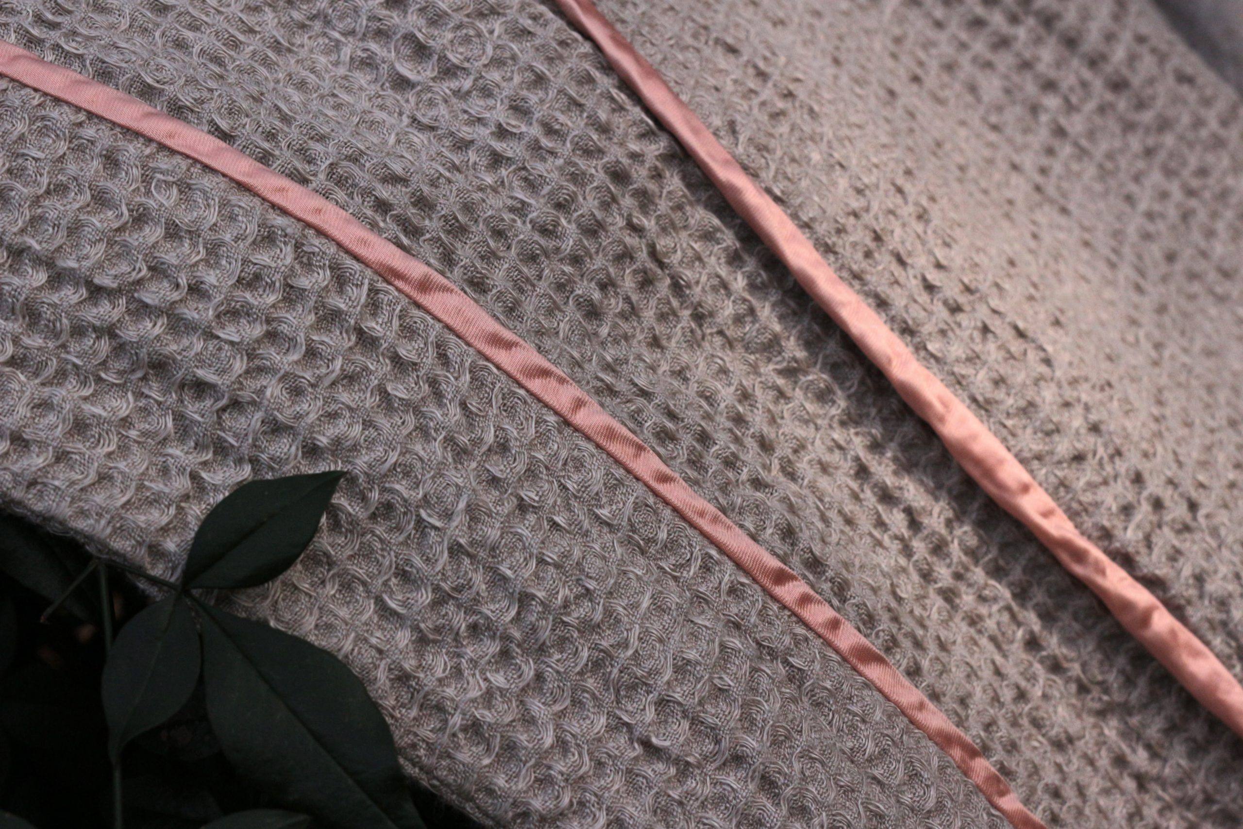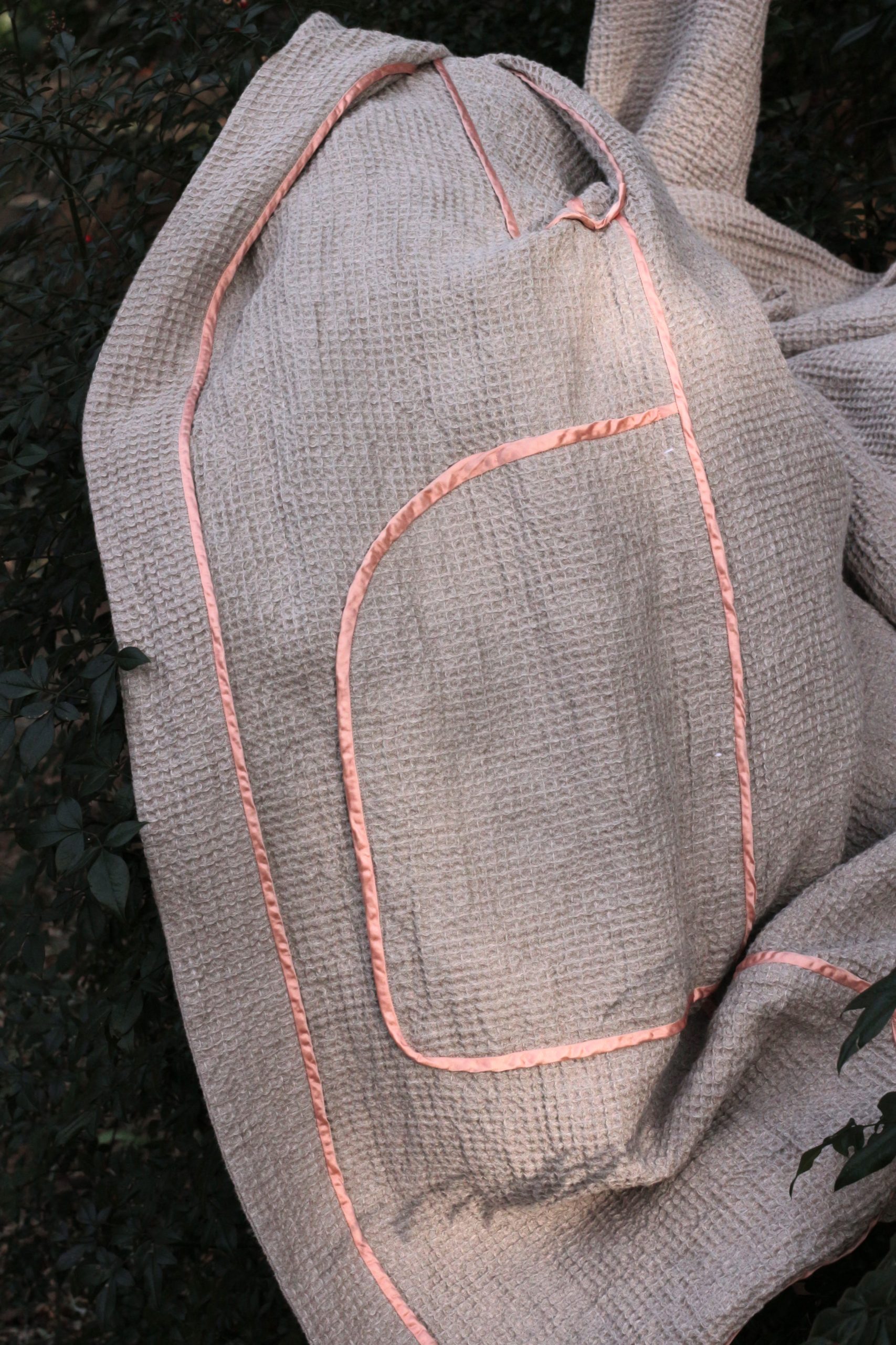 素材は、しっとりと中厚手のワッフルリネン。北欧・西洋でブランケットやキッチンクロスとして活用されている素材の実用性・堅牢性を服に仕立てています。着る方のサイズ感によって、伸びたり縮んだりするので、長く着るうちに肌に馴染み、その人だけの形に育っていく過程もお楽しみくださいませ。